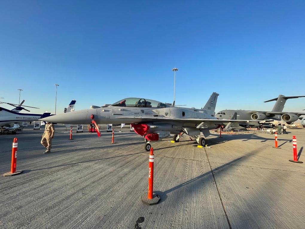 这是2021年11月14日在阿联酋迪拜国际航空展上拍摄的军用飞机(手机拍摄)。新华社记者苏小坡摄