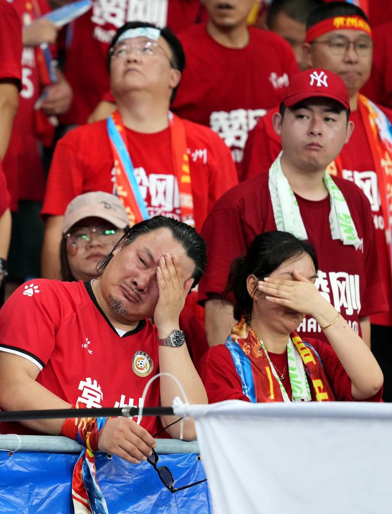 8月3日,“苏超”常州队客场0:5大比分负于盐城队赛后,常州球迷潸然泪下。新华社发(曹政 摄)