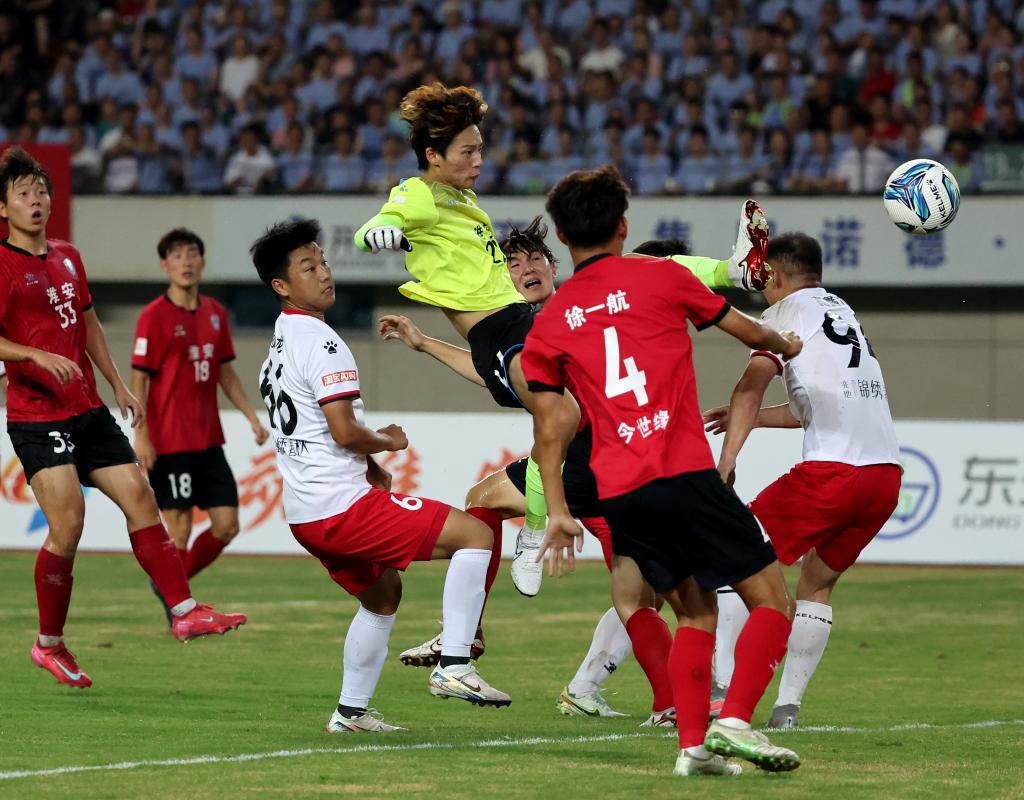 7月6日,淮安队门将李世恩(中)在“苏超”比赛中拼抢。新华社发(曹政 摄)