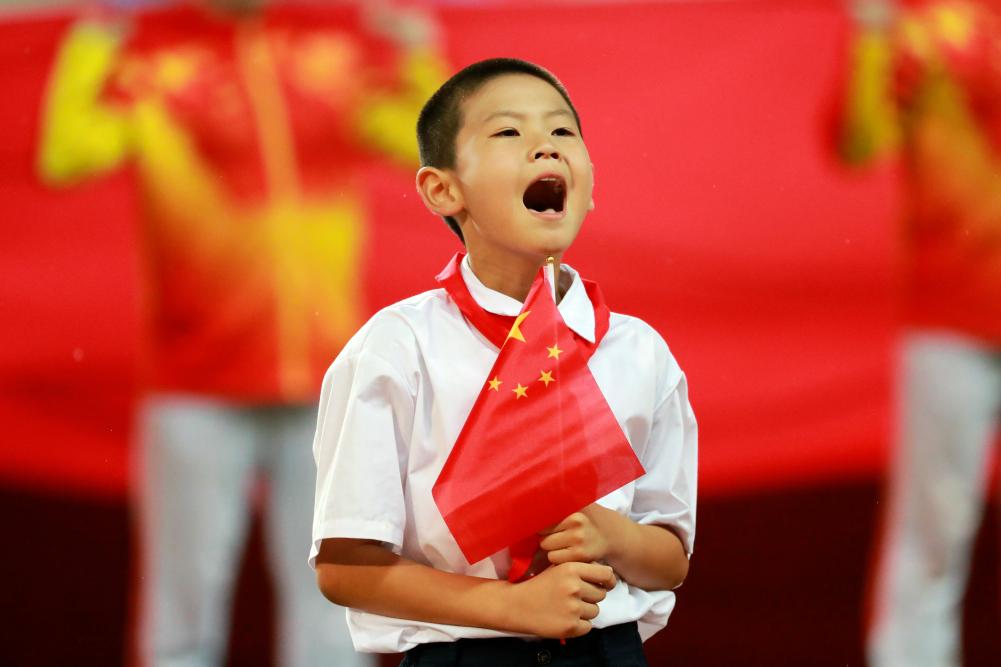 9月27日,小朋友在“苏超”淮安队对阵徐州队的比赛前演唱《歌唱祖国》。新华社发(徐昌政 摄)