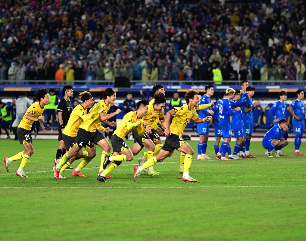 10月18日,泰州队点球战胜南京队晋级“苏超”决赛,泰州队球员庆祝胜利。新华社发(曹政 摄)