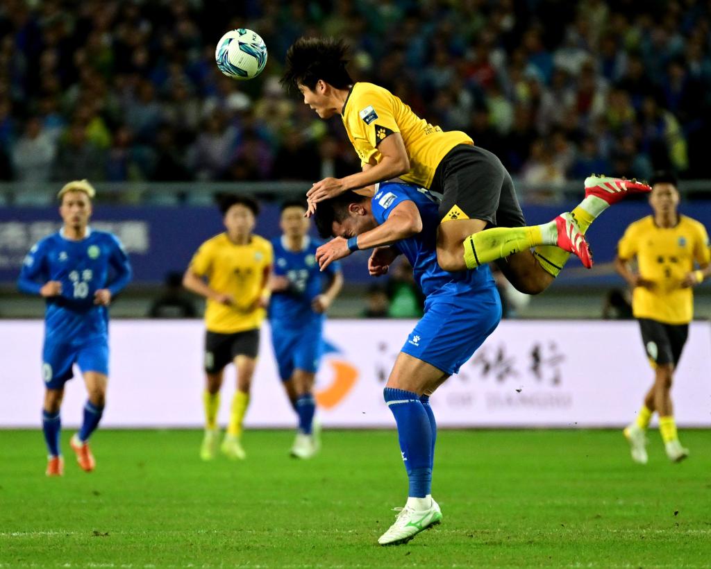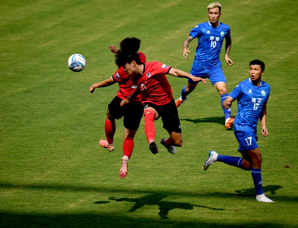 10月18日,在“苏超”半决赛中,泰州队球员(上)与南京队球员争顶头球。新华社发(曹政 摄)