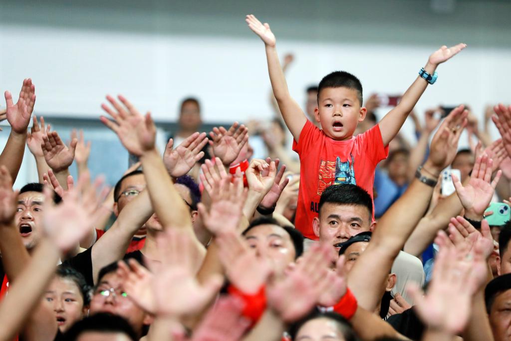 10月7日,小球迷在江苏南通举行的“苏超”四分之一决赛中为球队加油助威。新华社发(徐昌政 摄)