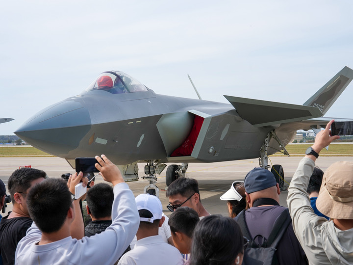 ↑2025年空军航空开放活动和长春航空展上,观众参观歼-20战机。新华社记者张楠摄