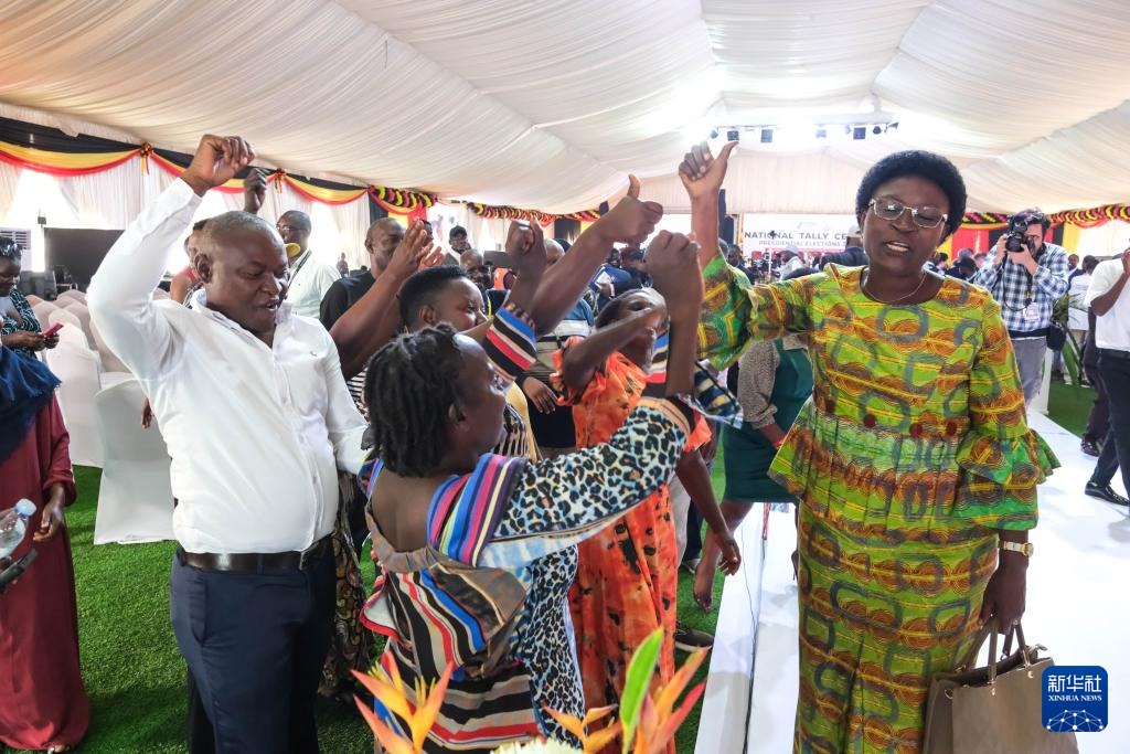 1月17日,在乌干达首都坎帕拉国家计票中心,执政党全国抵抗运动成员庆祝穆塞韦尼赢得总统选举。新华社发(阿佳拉·纳瓦达摄)