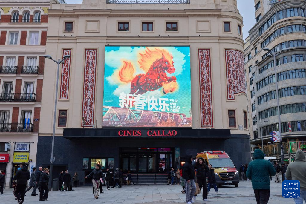 2月11日,西班牙首都马德里街头的一块显示屏播放中国春节主题视频。新华社记者 孟鼎博 摄