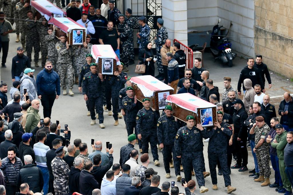 4月11日,在黎巴嫩西顿市,人们参加遭以军空袭丧生的13名安全人员的葬礼。新华社发(阿里·哈希绍摄)