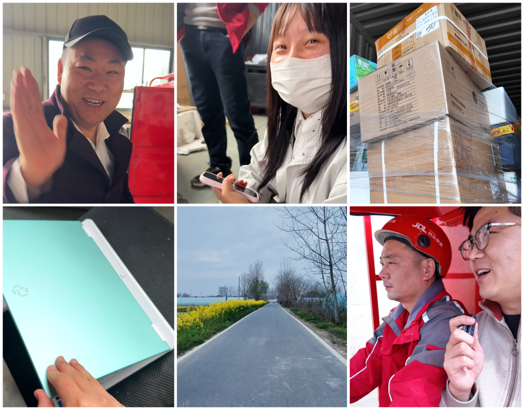 乡村快递站内,村民排队取件,快递员忙碌分拣。消费者当场拆开新电脑,喜悦之情溢于言表。