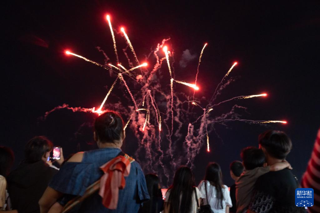 10月7日晚,人们在老挝首都万象湄公河畔观看烟花。