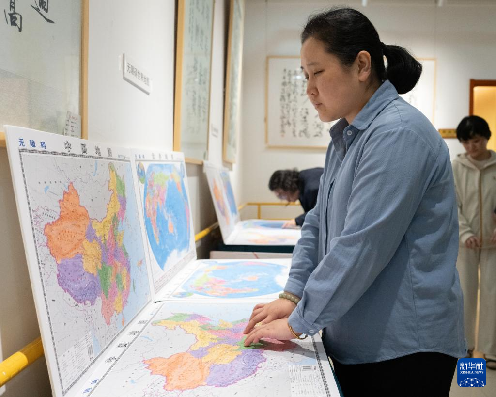 10月13日,视障人士在发布会后,触摸盲文版《无障碍中国地图》。