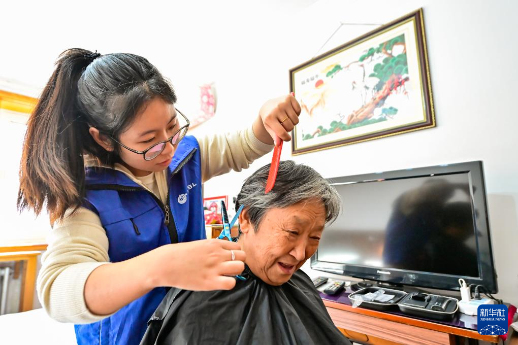 10月27日,在山东省青岛市城运颐养(李沧院)举办的喜迎重阳公益市集活动中,志愿者为老人免费理发。