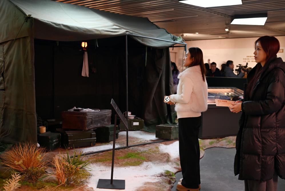 1月7日,观众在展览现场参观中国首个核武器研制基地——青海省海北州金银滩“三顶帐篷起家”的复原场景。新华社记者刘颖 摄