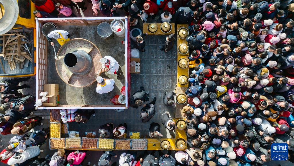 1月26日,在宁夏固原市隆德县民俗文化节现场,工作人员熬制腊八粥(无人机照片)。