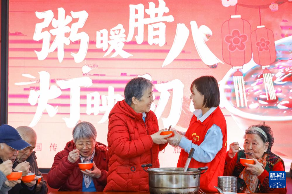 1月26日,在山东省青岛市李沧区颐福养老院,志愿者为老人们送上腊八粥。