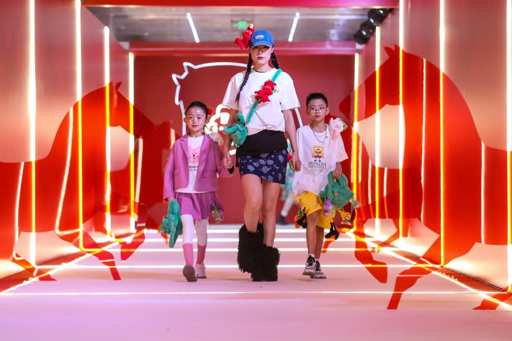 最受瞩目的,是以“马力全开”为主题的走秀。灯光闪动中,模特身着“绿马”元素服饰依次亮相,手中举着绘有铜奔马纹样的丝巾、礼盒,在舞台与观众之间缓缓行进。