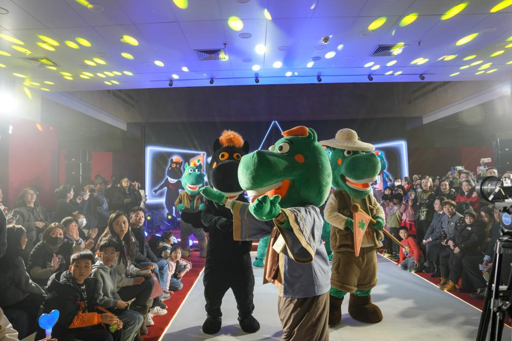 1月26日晚,在甘肃省博物馆一楼大厅,铜奔马IP人偶在“马力全开——博物馆启航夜”活动现场与观众互动。新华社记者 郎兵兵 摄