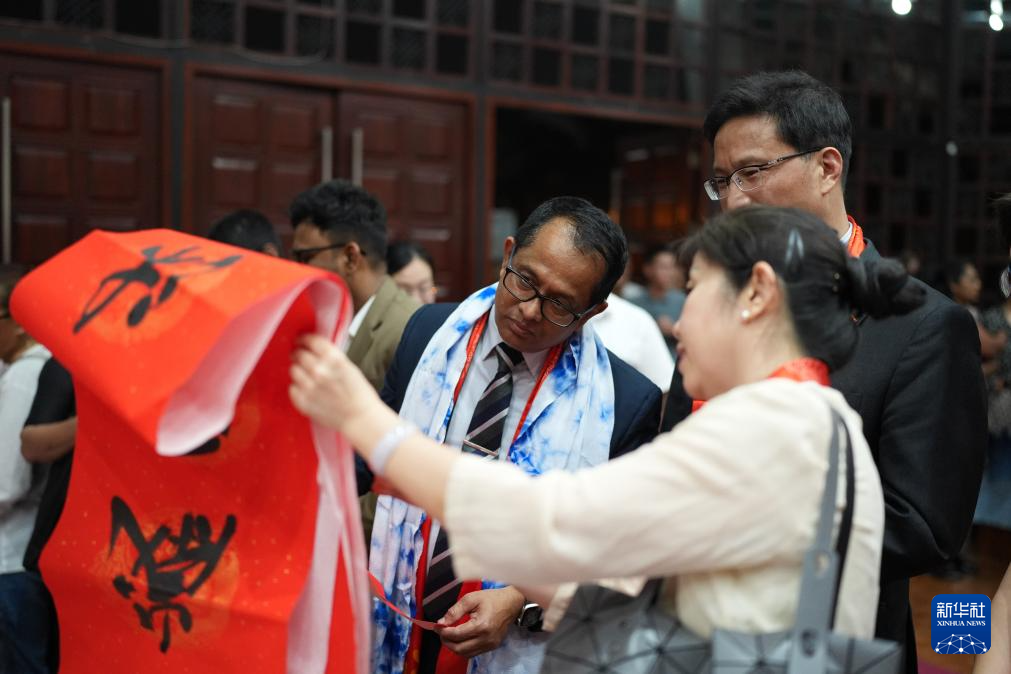 1月27日,在斯里兰卡科伦坡,斯里兰卡议长贾加特·维克拉马拉特纳(左)出席“欢乐春节”活动。