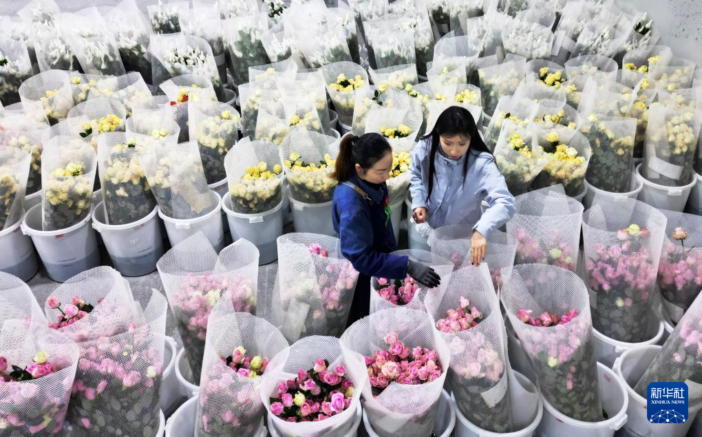 2月1日,在甘肃省临夏市枹罕镇的亿农国际鲜花港保鲜冷藏室内,工人在整理鲜花,供应节日市场。