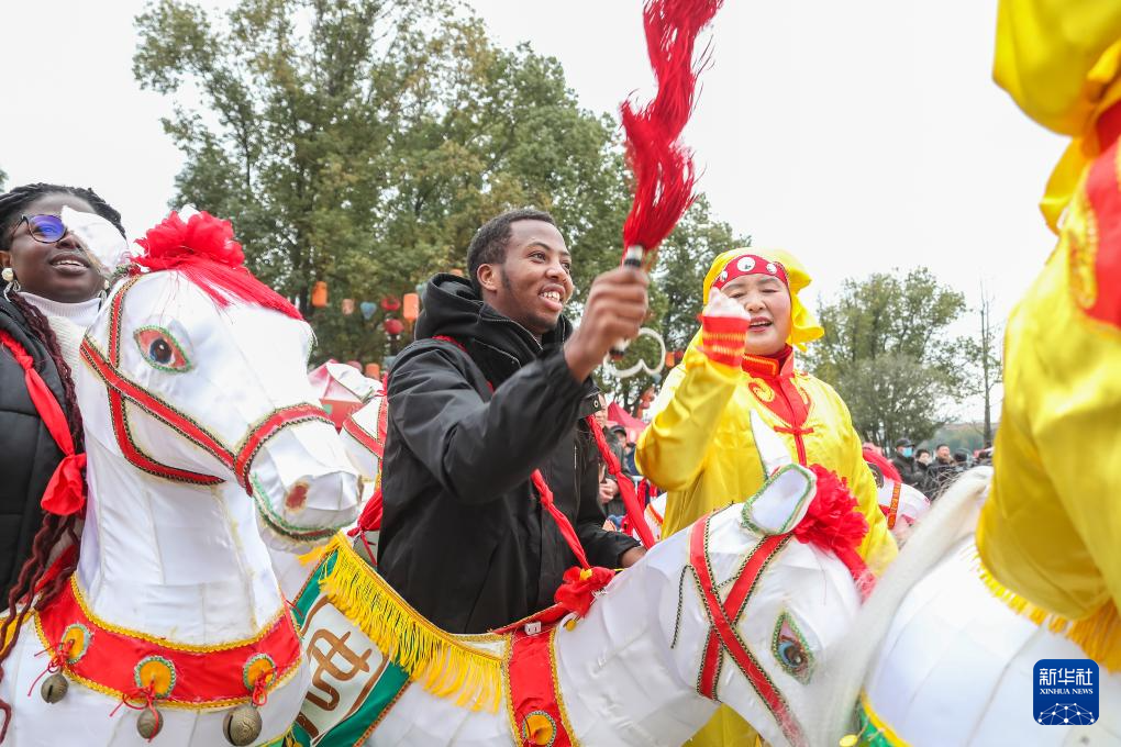 2月7日,外国留学生在江苏省句容市举办的年货大集活动中体验“马灯阵舞”表演。
