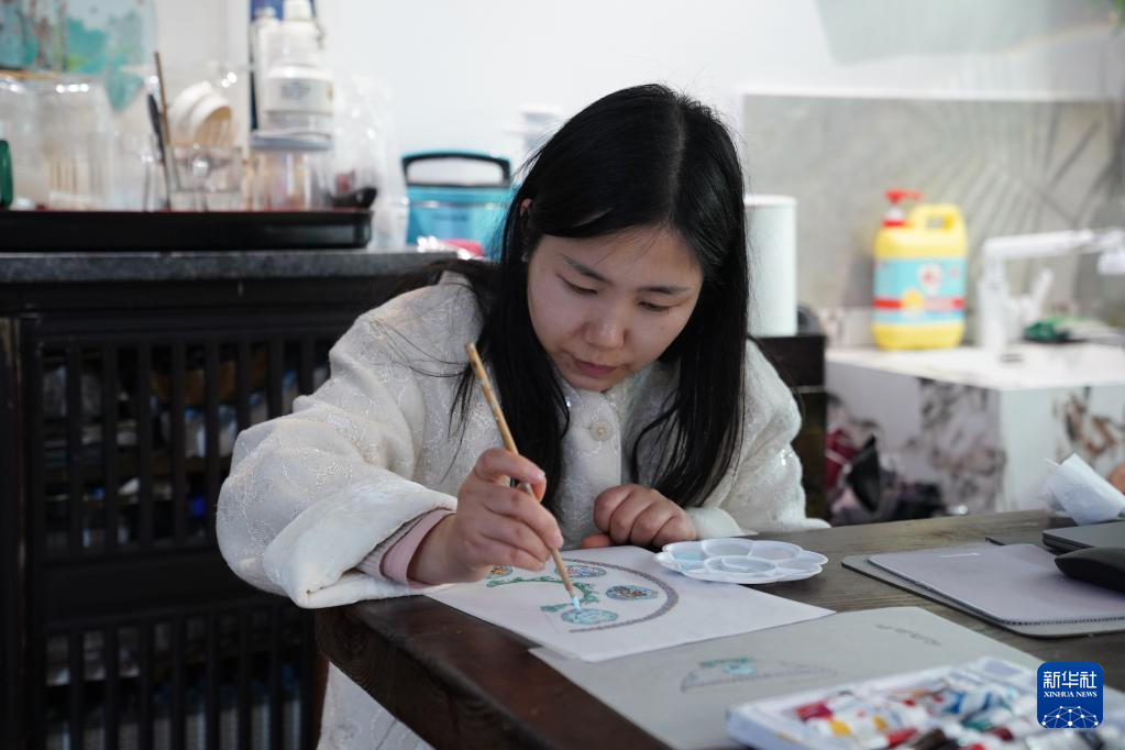 胡韵月在工作室创作(3月11日摄)。