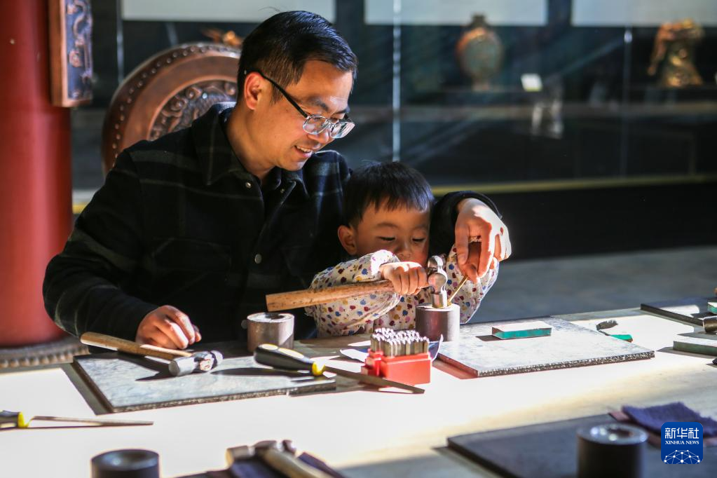 3月25日,在会泽县国家级非遗斑铜制作技艺传习馆,张氏斑铜第十三代传人张伟在教儿子敲打铜器。传习馆开设在会泽古城江西会馆内,江西会馆又称万寿宫,始建于清康熙年间。