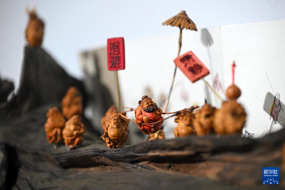 这是展出的残疾人核雕作品《钟馗夜巡》(4月16日摄)。