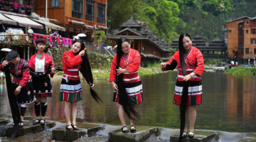 4月20日,游客在肇兴侗寨内体验非遗项目靛染。