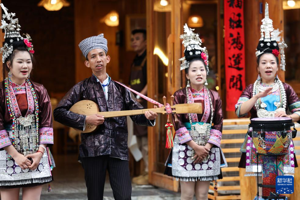 4月20日,肇兴侗寨一家餐馆的员工在给游客弹唱侗族琵琶歌。