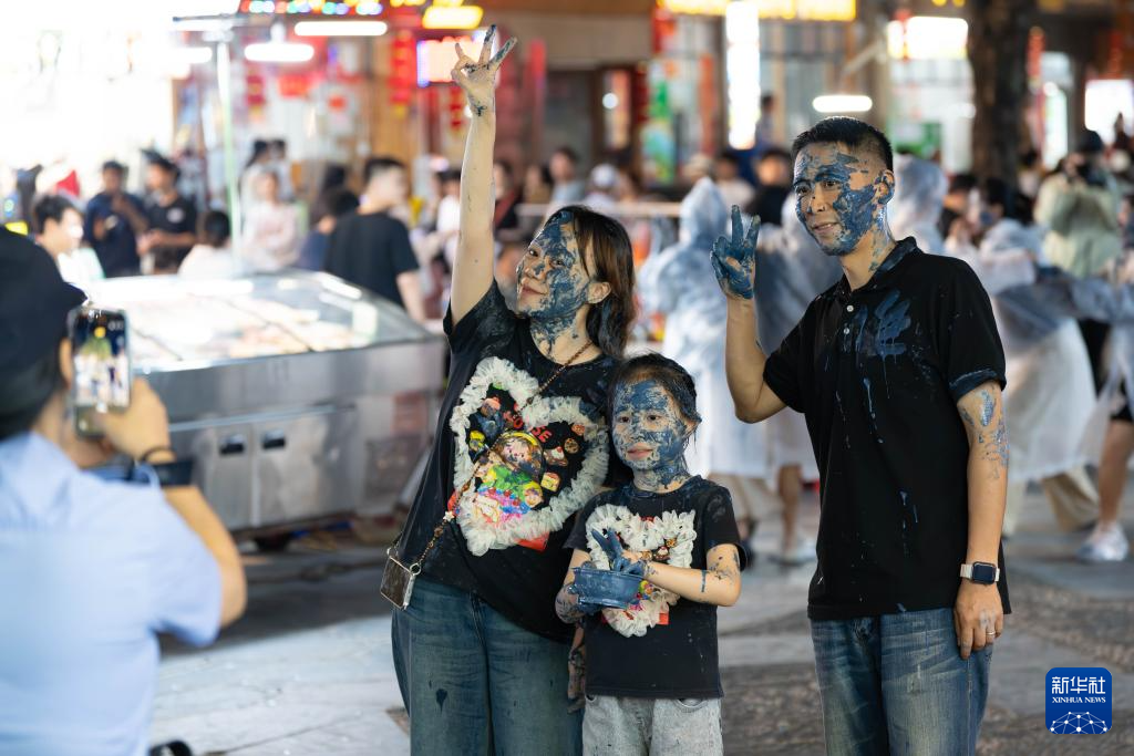 4月18日,在贵州省黎平县肇兴侗寨内参与谷雨节“打花脸”活动的游客在合影留念。