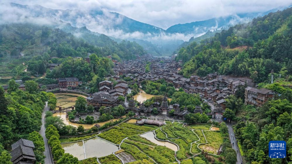 4月20日拍摄的肇兴侗寨雨后风光(无人机照片)。