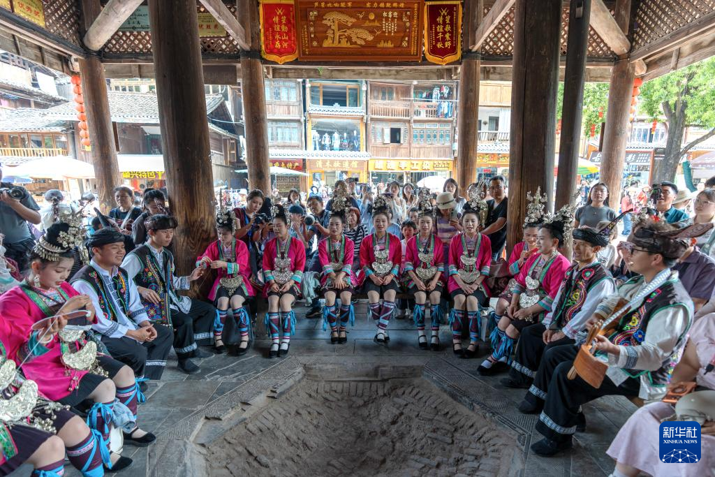 4月19日,歌手在肇兴侗寨鼓楼下为游客演唱侗族大歌。