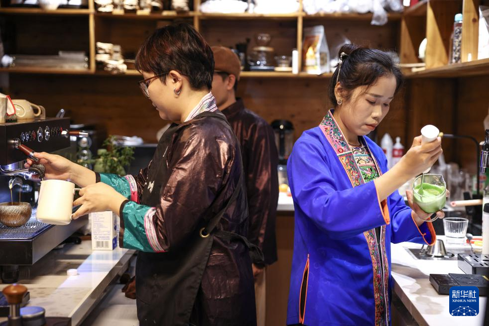 4月20日,村民付王梅(右)在肇兴侗寨鼓亭全景咖啡馆里为顾客制作茶饮。
