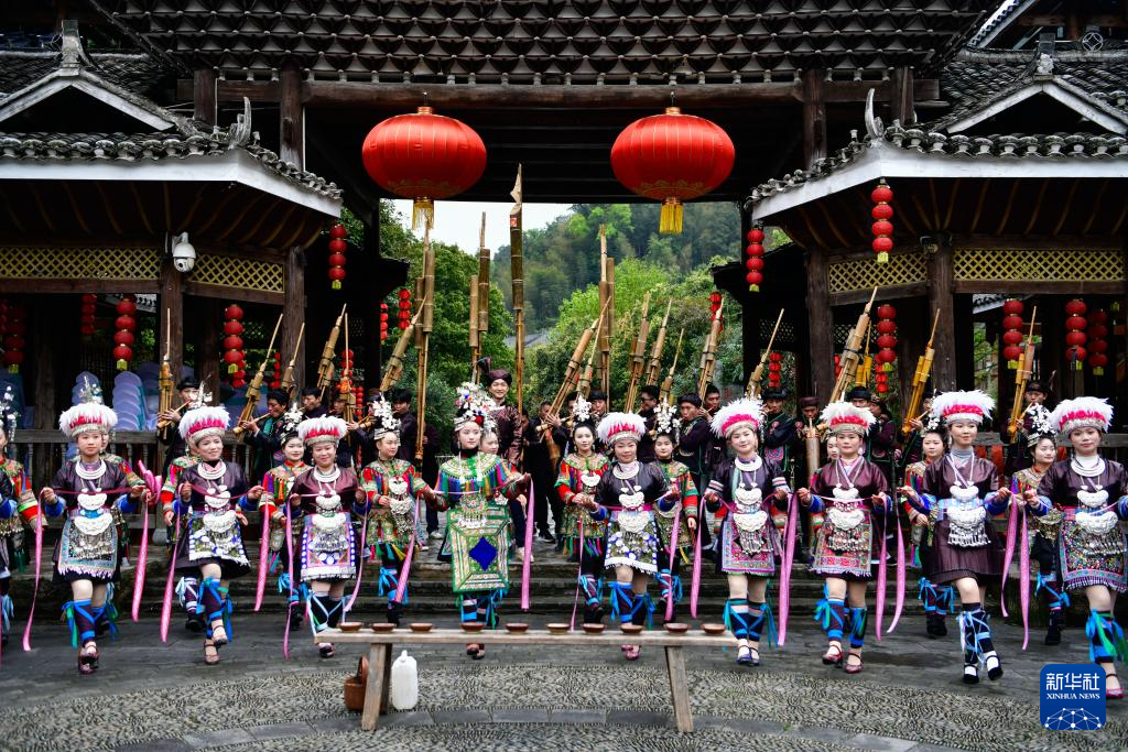 侗族群众在肇兴侗寨为来宾举办寨门迎宾仪式(3月23日摄)。