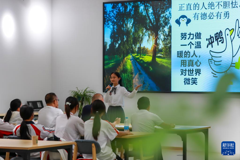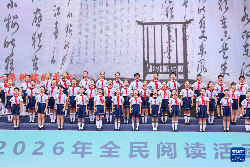 4月21日,学生在江苏省泰兴市新时代文明实践中心广场表演童声合唱《书香里的中国》。