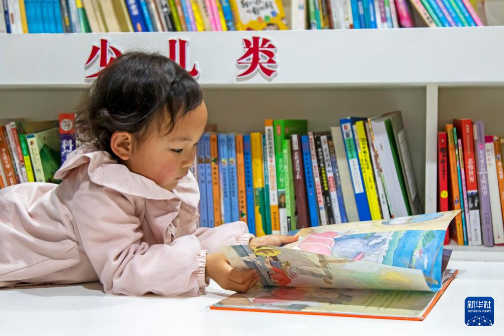 4月22日,小朋友在湖北省恩施市小渡船街道机场路社区图书屋内阅读绘本。