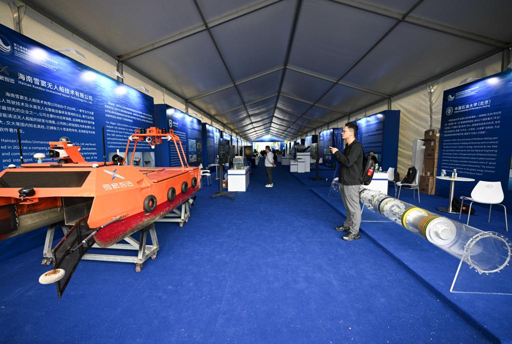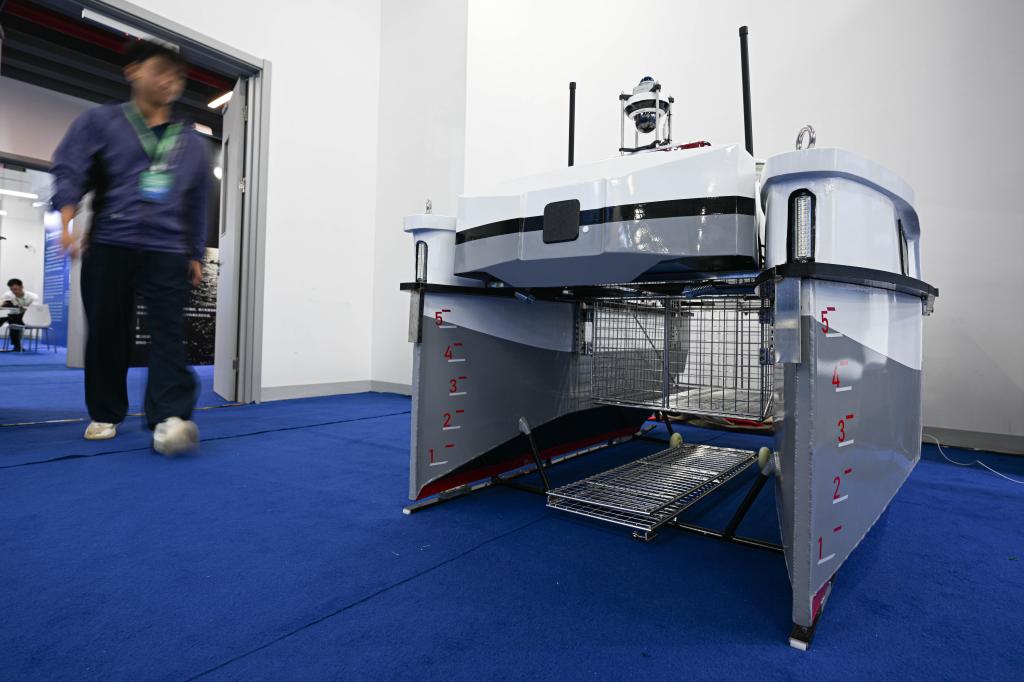 10月29日在深海先进技术及装备成果展上拍摄的智能巡航水面保洁无人船。