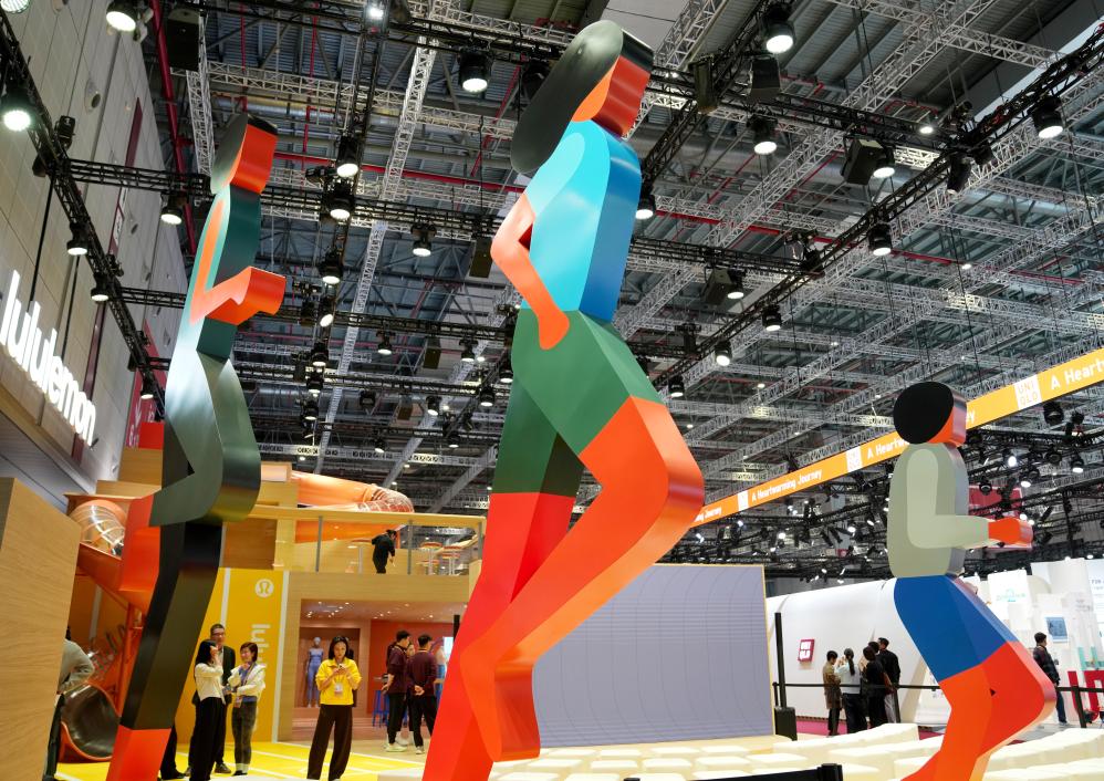 这是11月5日在第八届进博会消费品展区拍摄的露露乐蒙(lululemon)展台。
