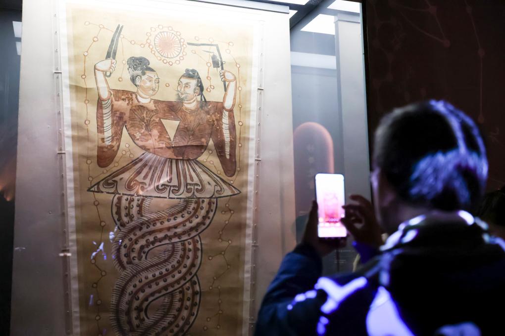 1月20日,观众在展览上拍摄唐代的彩绘伏羲女娲绢画(胡风)。