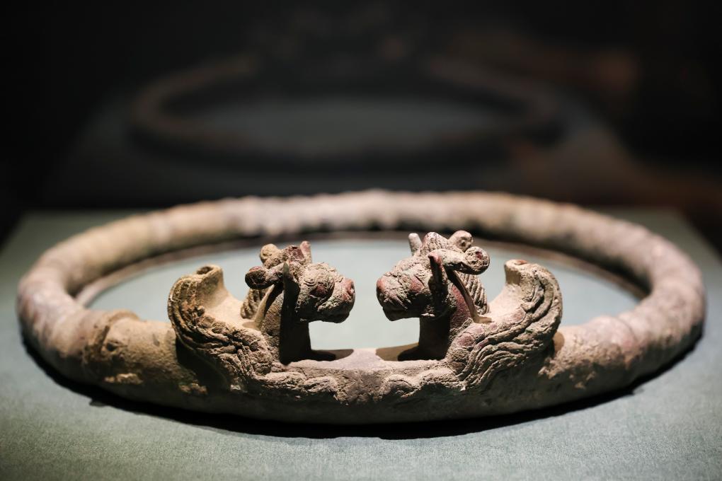 这是1月20日在展览上拍摄的战国时期的翼兽对视铜环。