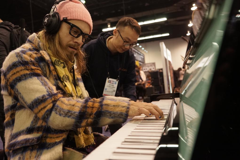 1月22日,在美国加利福尼亚州阿纳海姆会展中心,参观者在珠江钢琴展位试弹智能跨界钢琴。新华社发(曾慧摄)