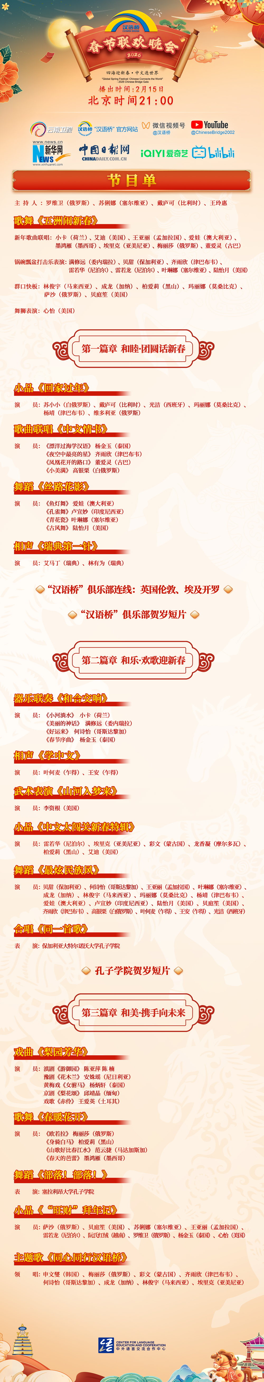 敬请锁定2月15日21:00云南卫视、“汉语桥”官方平台、新华网、中国日报网等平台,收看“四海迎新春·中文连世界”——2026“汉语桥”春节联欢晚会。让我们共同见证全球青少年共庆新春、携手未来的文化交流盛典!