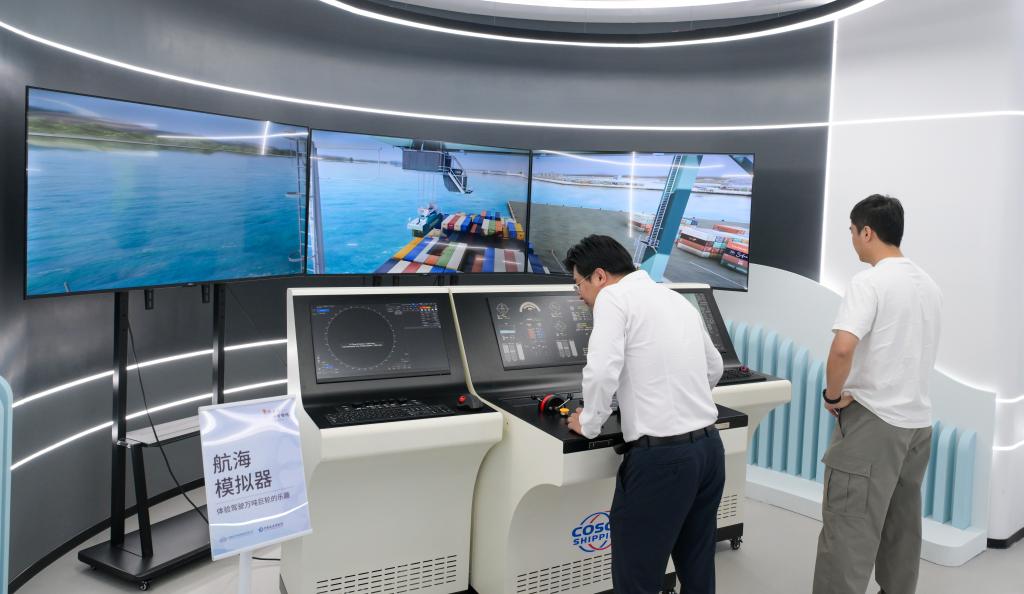 3月19日,观众在“一带一路”主题数字展上体验航海模拟器。