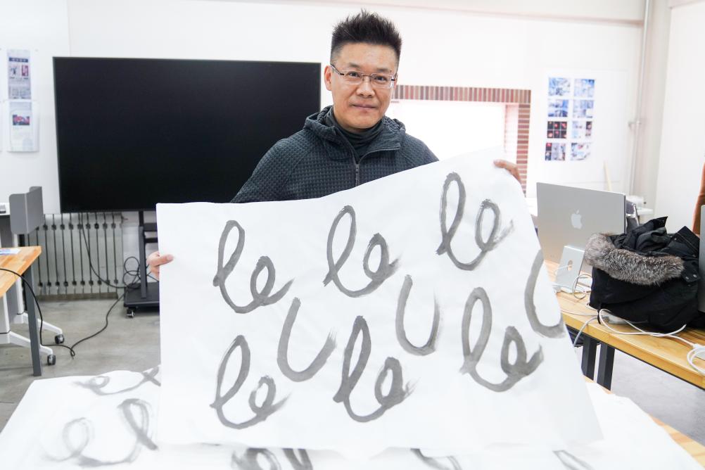 图为会徽设计团队的主创设计师郭昱峰手持设计草图。新华社记者 许畅 摄