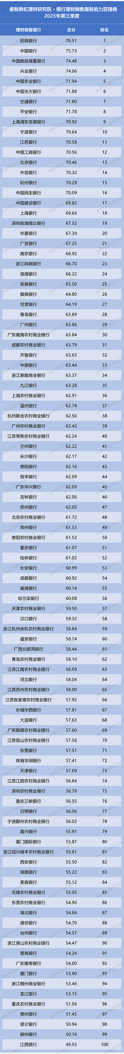 表1 银行理财销售服务能力百强榜(2025年第三季度)