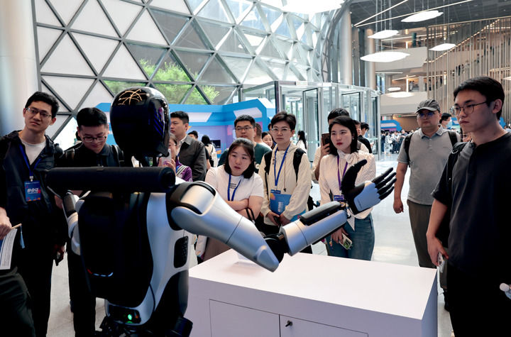 智元机器人远征A2在2025张江具身智能开发者大会会场外的展台上向参观者挥手致意(2025年5月29日摄)。