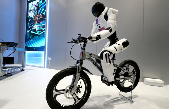2025年4月29日,这是一个在进行骑自行车演示的智元机器人。