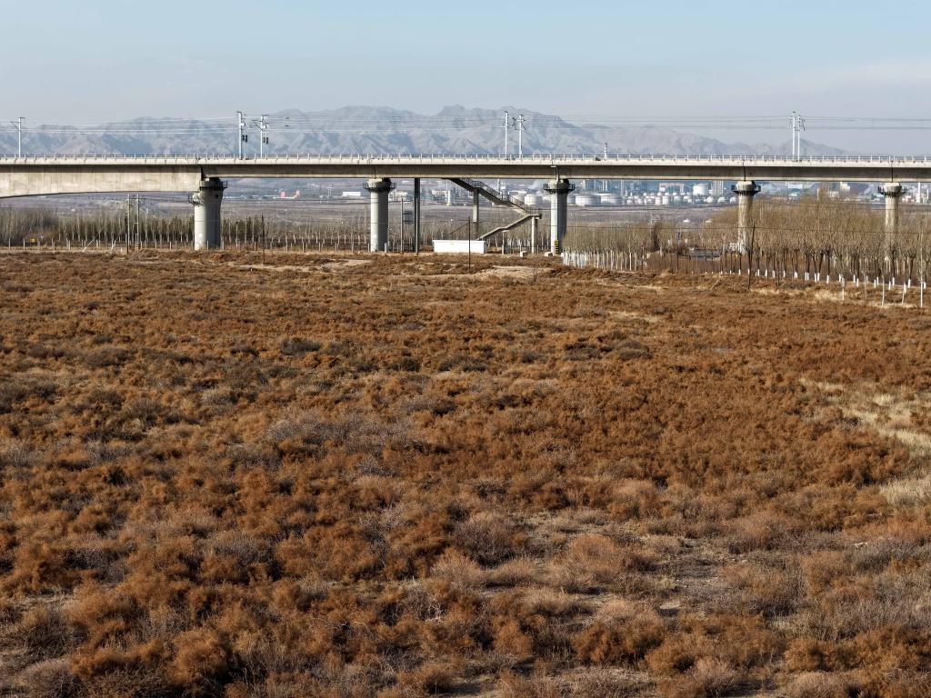 这是12月11日拍摄的包银高铁二道坎跨京藏高速特大桥,桥下是内蒙古西鄂尔多斯国家级自然保护区乌海片区(无人机照片)。新华社记者 李志鹏 摄