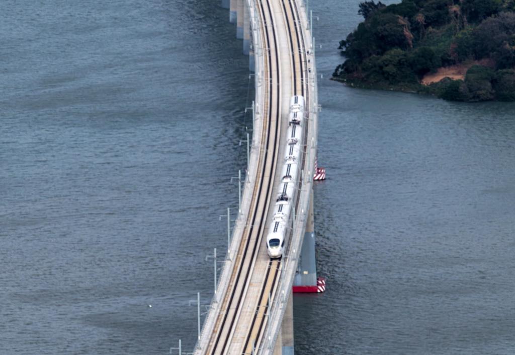 12月22日拍摄的行驶在汕头濠江特大桥上的高铁列车。新华社发(姚军摄)