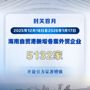 记者当天从海关总署获悉,据海口海关统计,受自贸港封关利好吸引,自2025年12月18日封关以来截至2026年1月17日,海南新增备案外贸企业5132家。