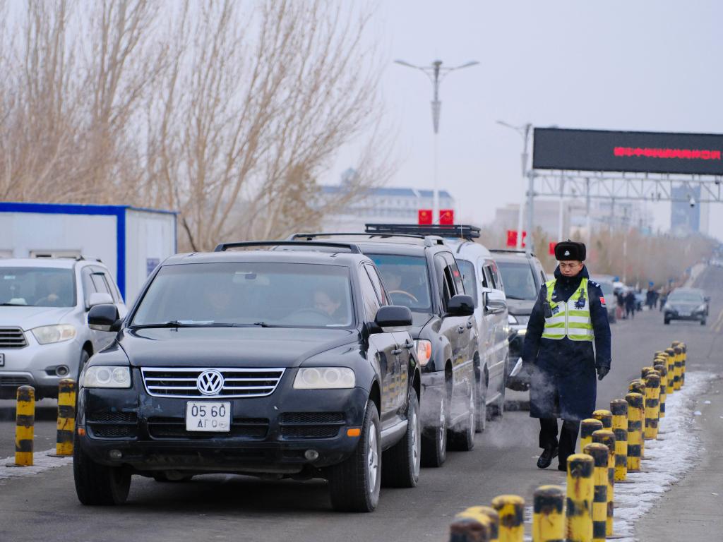 2025年12月23日,出入境货车排队通过满洲里公路口岸。新华社记者 马金瑞 摄